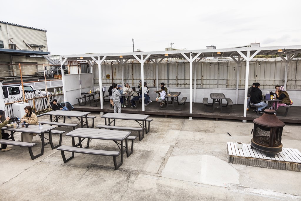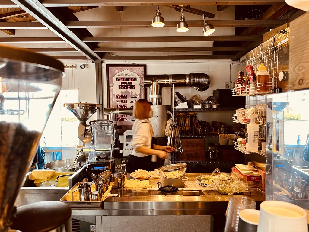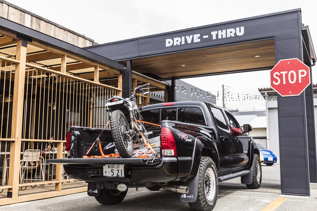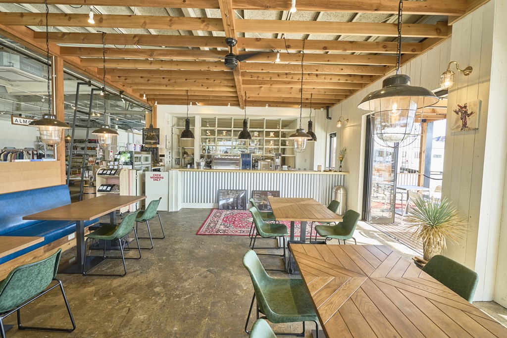 通りに面した側はアメリカンなカフェスタンドとなっており、自慢の自家焙煎珈琲やハンバーガーなどを楽しむことができる。他にもアルコール類や単品メニューも充実。バイクを停めるスペースもある。またコストコの駐車場にも近いため、買い物帰りにカフェ利用で訪れる人も多いそうだ。