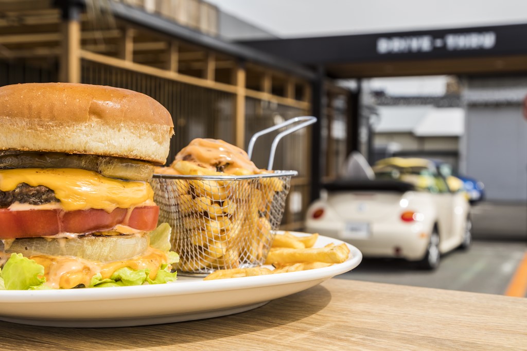 カリフォルニアの雰囲気をもつカーショップ「カリフォルニアモーターズ」。そこのカフェ「スタークコーヒー」のグルメバーガーがもっぱらのウワサに。見るとチーズたっぷりで肉々しいパテのビジュアルに思わずヨダレが……。