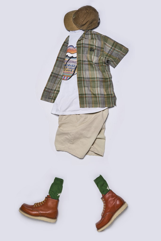 夏のショーツスタイルは、#875と相性抜群。チラ見せする靴下の色味とトップスの色味を合わせることで、全体にまとまりが生まれる。白Tシャツを挿すことで爽やかな印象が強くなる。