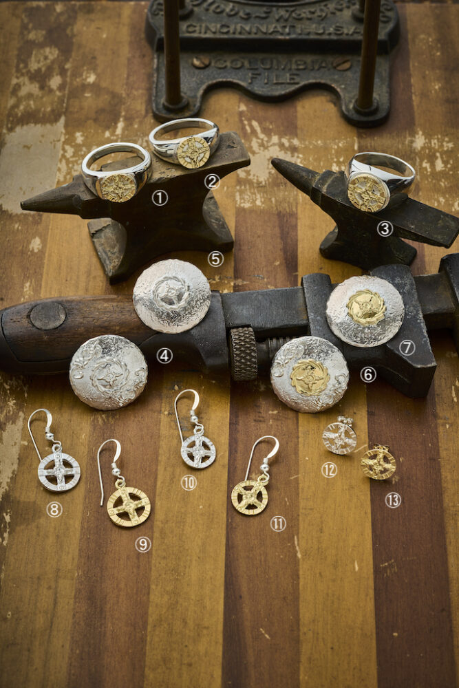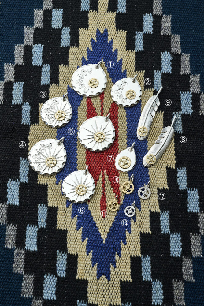 新作のメディスンマークのリング、ピアス、そして、特殊加工によりざらついた質感を持たせた新作のコンチョには従来の太陽がモチーフのブランドロゴマークが付く。比べると小さなパーツながら印象が大きく変わるのがおわかりいただけるだろう。数ある作品からお気に入りを見つける旅路もお楽しみあれ。