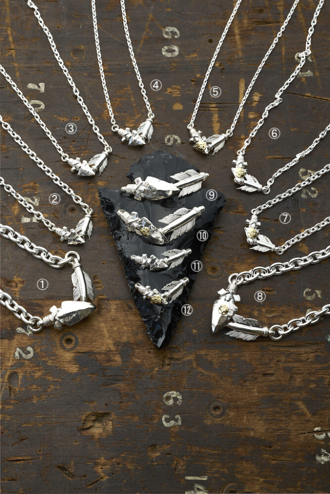 もうひとつの新作は、ファーストアローズのブランドを象徴するモチーフ、矢じりと矢羽をアレンジした全く新しいファーストアローズチェーンチョーカー。完成度の高さから単品でも十分楽しめるが、お気に入りのペンダントヘッドと組み合わせることで自分だけのオリジナル作品を作るのもおすすめだ。