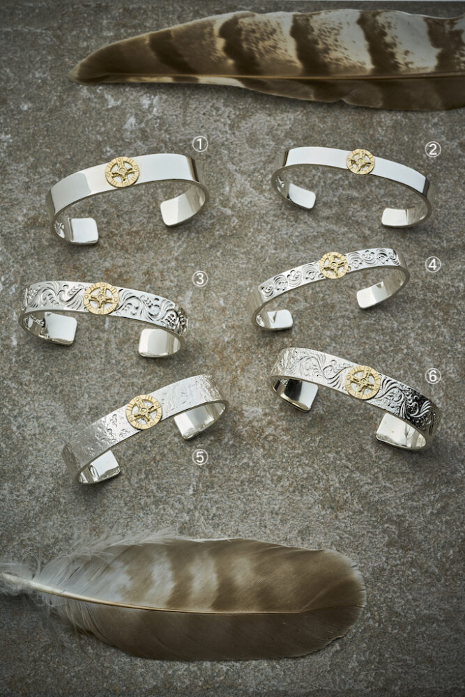 メディスンホイールと全ての起源である太陽をモチーフにしたブランドロゴを組み合わせた18金のマークをあしらったバングルシリーズ。4つの穴があるホイールは、ネイティブアメリカンの間では東西南北などの自然界や人間の一生のサイクルを表し、自身の進む方向を示してくれるお守りとして用いられる。