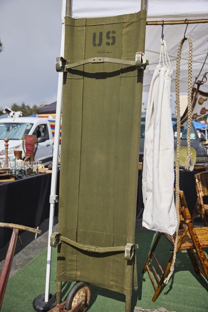 リアルミリタリーの担架。固定具もしっかり使えるコンディション……とは言え、担架は担架として以外の用途が見つけられないので、欲しかったけど購入を断念。275ドル
