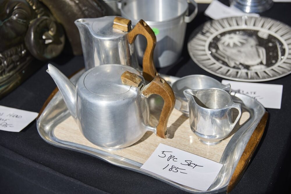 アンティークのステンレス製ティーポット他5点セット。北欧や英国でポピュラーとなったウッドハンドルデザイン。185ドル