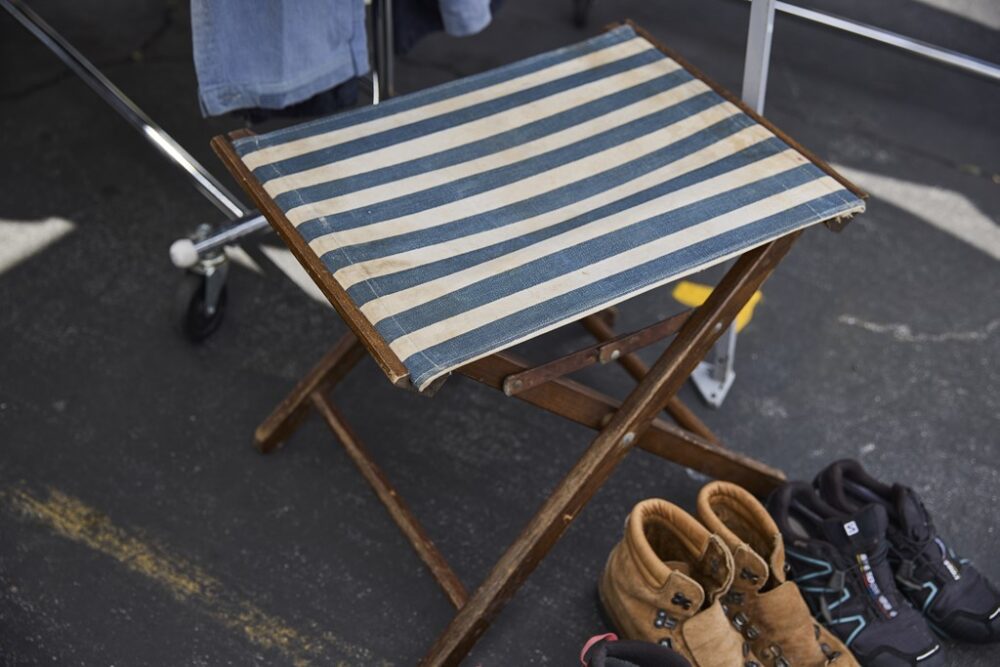アンティークのアウトドアフォールディングチェア。マリンカラーのストライプが美しいじゃないか! コットンの座面にウッドのフレーム。現代ではありそうで見つけられない逸品。