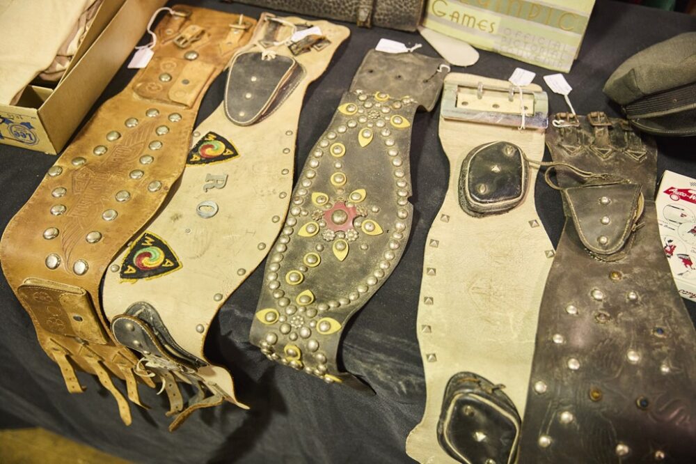 バイクがリジッドだった時代にライダーには欠かせなかったキドニーベルト。手の込んだスタッズカスタムが美しい。