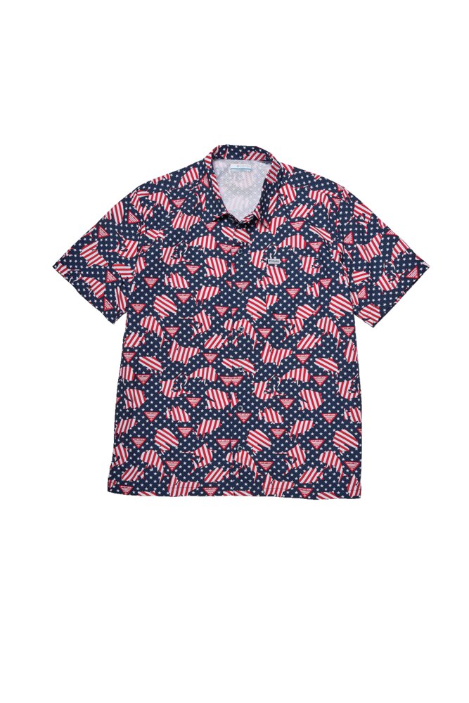 人気のPFGシリーズでリリースしている総柄のシャツ。星条旗モチーフながら魚のカタチを取り入れた遊び心溢れる1着。6160円(コロンビアスポーツウェアジャパン TEL0120-193-803)