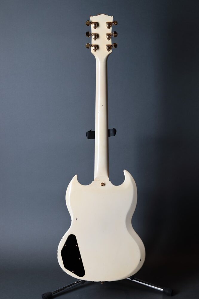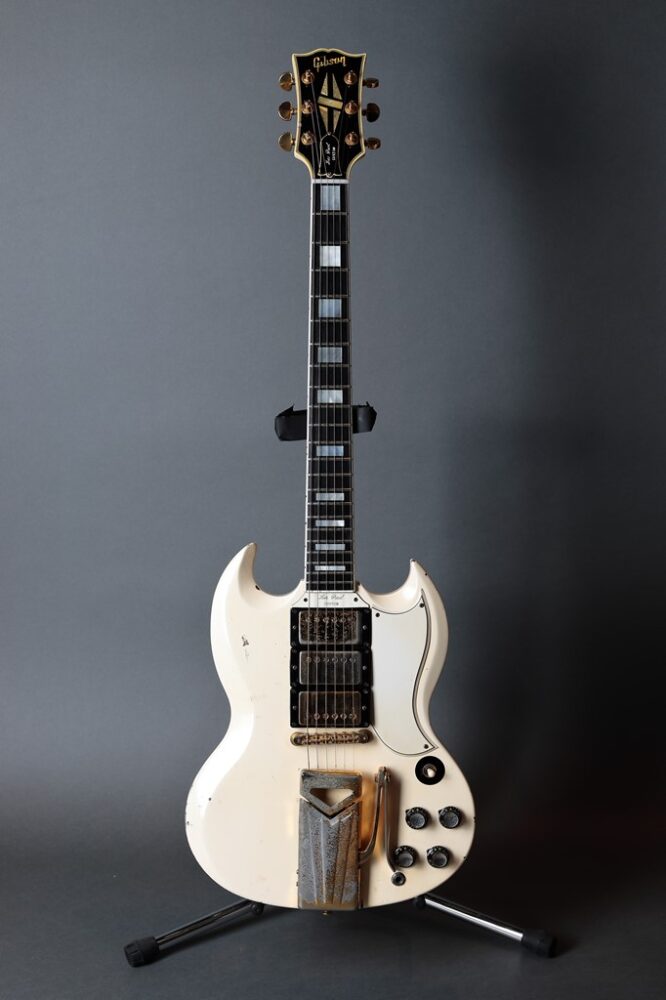 以前CMで福山雅治が手にしていたこともある、ポラリス・ホワイト・フィニッシュのSGカスタム。1961年からレスポール(※カスタムは’61年途中)が、写真のようにダブルカッタウェイ・シェイプかつ薄く軽いボディへと大幅にモデル・チェンジ。これはフェンダーへ対抗した結果とも言える。SGカスタムとスタンダードには、ギブソンが開発したスウィング・アウェイ・プル・サイドウェイ・トレモロが取り付けられた。