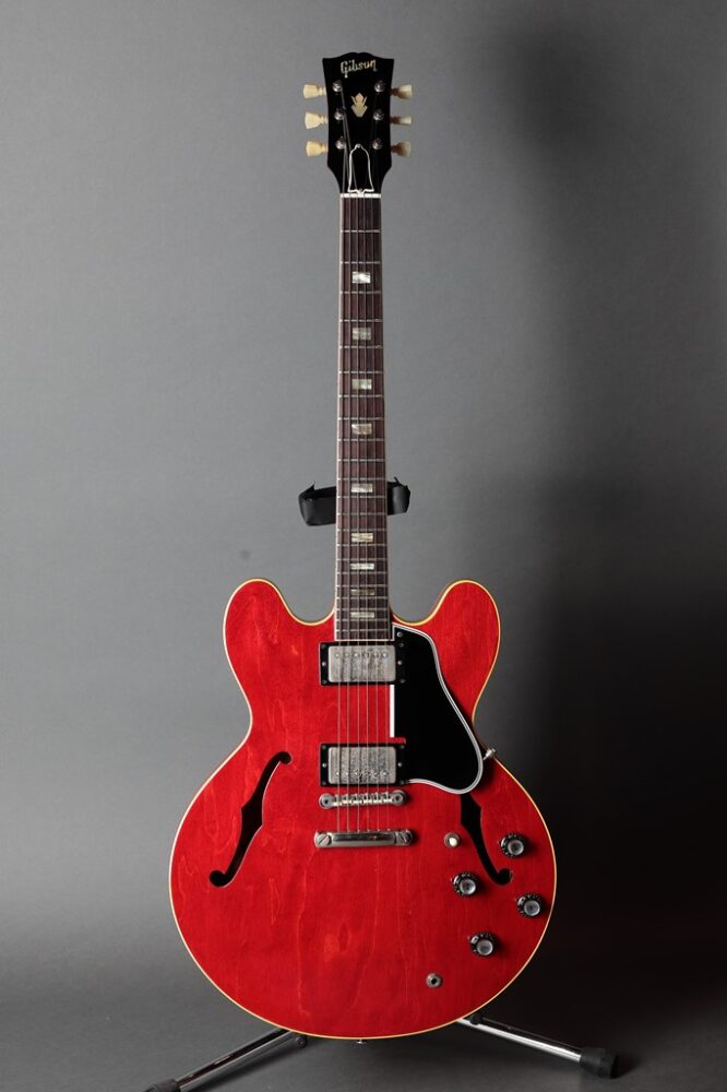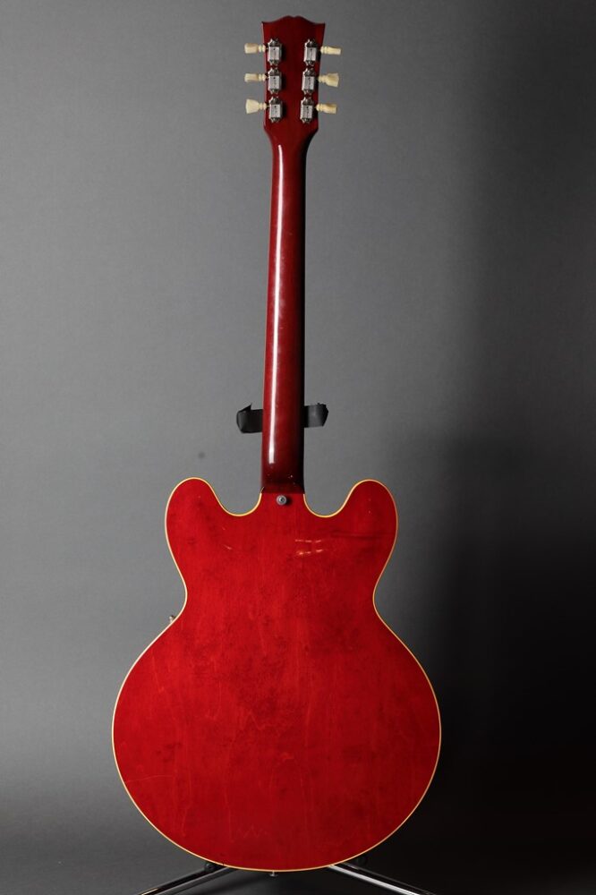 ボディにfホールがあり、内部がホロウ構造のアーチトップ・ギターと、ソリッド・エレクトリック・ギターの良さを併せ持つ、世界初のセミ・アコースティック・ギターが1958年に登場したES-335だ。写真は’62年製で、エリック・クラプトンがクリーム時代に愛用した、’64年製のチェリー・レッドのES-335TDと仕様が近く人気がある。指板のポジションマークがブロックになっている点も特徴のひとつ。
