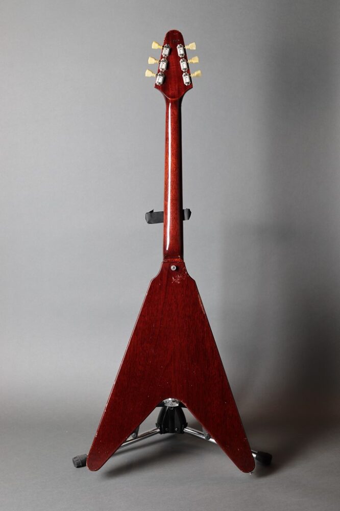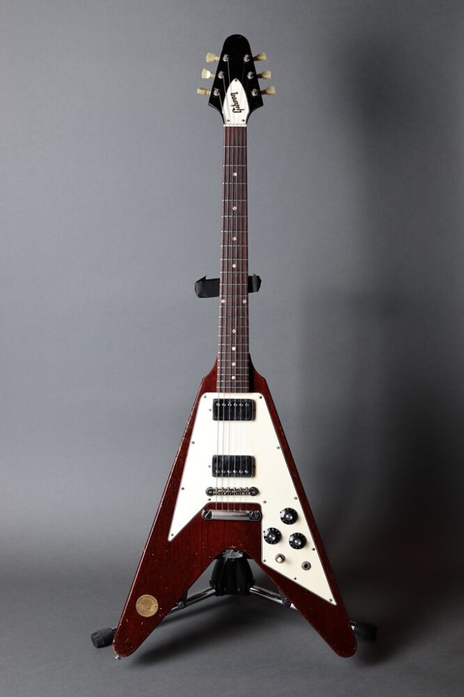 マイケル・シェンカーが使用したことでも有名な変形ギターの代表モデル、フライングVは1958年に誕生した。ギブソンが“モダニスティック・ギター” としてエクスプローラーと共に力を入れて開発したモデルだったが、当時は最先端過ぎて受け入れられず、楽器店の看板として使われたといった逸話まで残る。これは’71年に350本ほど限定生産された“メダリオン” と呼ばれるチェリー・レッドのフライングVだ。