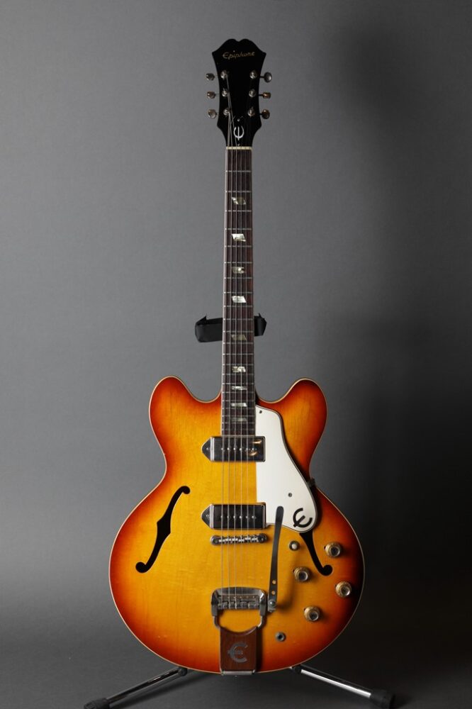 エピフォンの中で、最も有名なモデルがカジノだ。ビートルズのジョン・レノン、ポール・マッカートニー、ジョージ・ハリスンが使ったことで、世界的に人気となった。ボディはES-335と似ているが、内部は空洞のフル・アコ構造。そのためアコースティック・ニュアンスの強いサウンドが魅力となる。写真は’64年製でエピフォン・オリジナルのビブラート・ユニット “トレモトーン”が付いている。