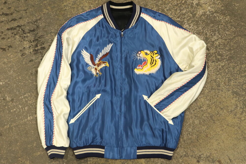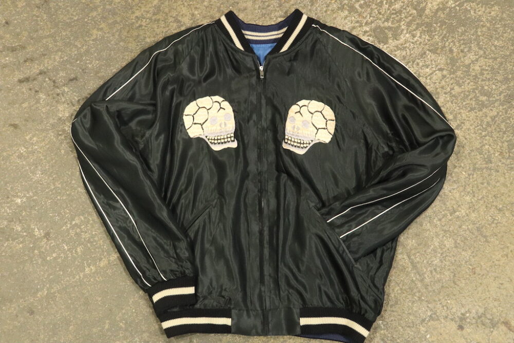 ヴィンテージのスカジャン(スーベニアジャケット)を販売していたテーラー東洋のアイテム。数ある虎をモチーフにしたスカジャンのなかでも、虎の全身が真横からのアングルで描かれたモノは珍しく、刺しゅう糸の色の使い分けまでヴィンテージに準じた意欲作。リバーシブル面はヴィンテージで希少価値が高い髑髏柄を再現している。ヴィンテージでは別珍素材だったが、このモデルは季節を問わず着用できるよう、アセテートで再構築されている。6万500円