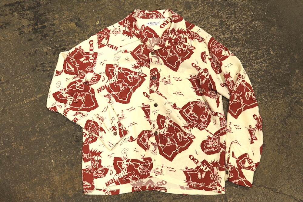 1940年代後半に発表された柄で、アメリカ本土からの観光客に非常に人気で、文字の書体が変更された柄や、さらにデザインに手を加えた柄も当時撮影された写真などで確認されているほどの名作。観光用のパンプレットにも似たイメージを持つこのデザインは、スーベニア・アイテムとしてのアロハシャツの原点ともいえる1枚。1万7380円