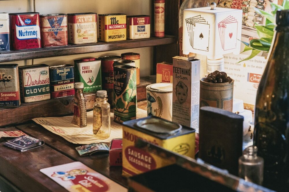 調味料などが入っていた金属製のパッケージもすべてヴィンテージ。様々なデザインがあるので、直感だけで選んでみるのもおもしろいはず。