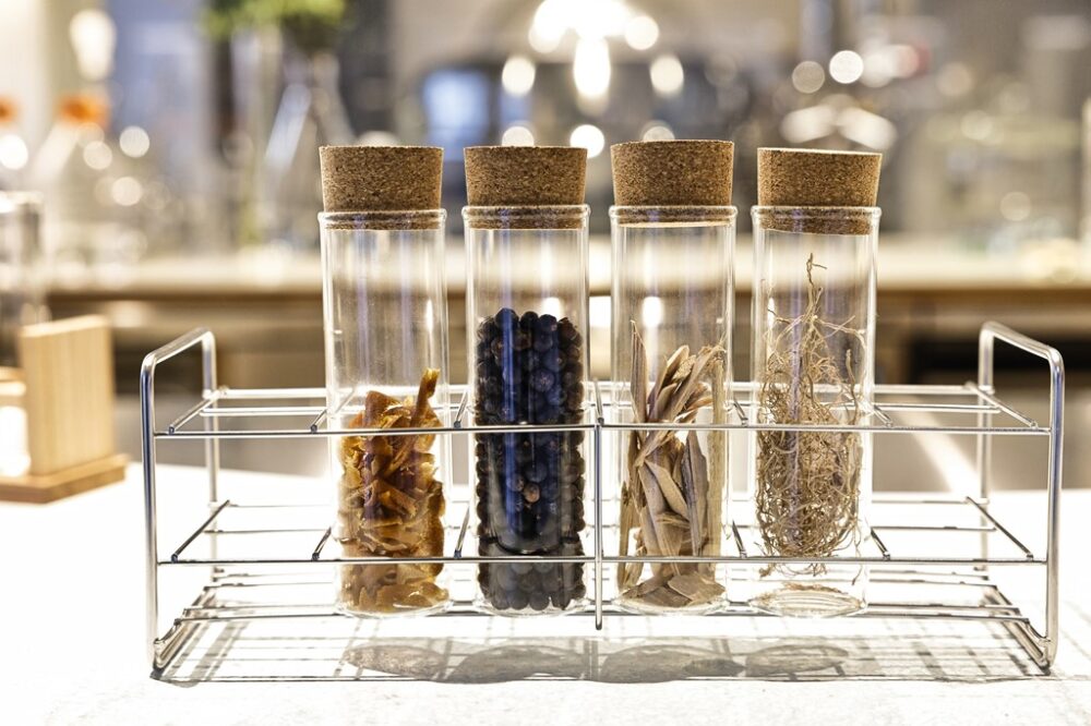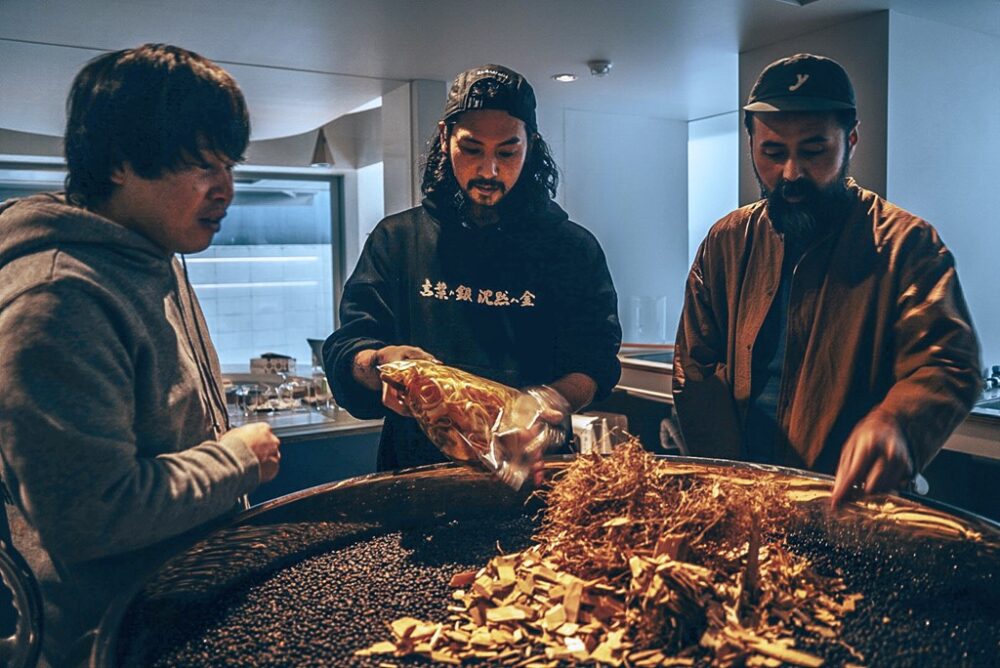 ジュニパーベリーに続いて投入するのが、レモンピールやベチバー、青森ヒバなど。さらに生姜や大葉なども取り入れて、独自の配合でブレンドしていく。