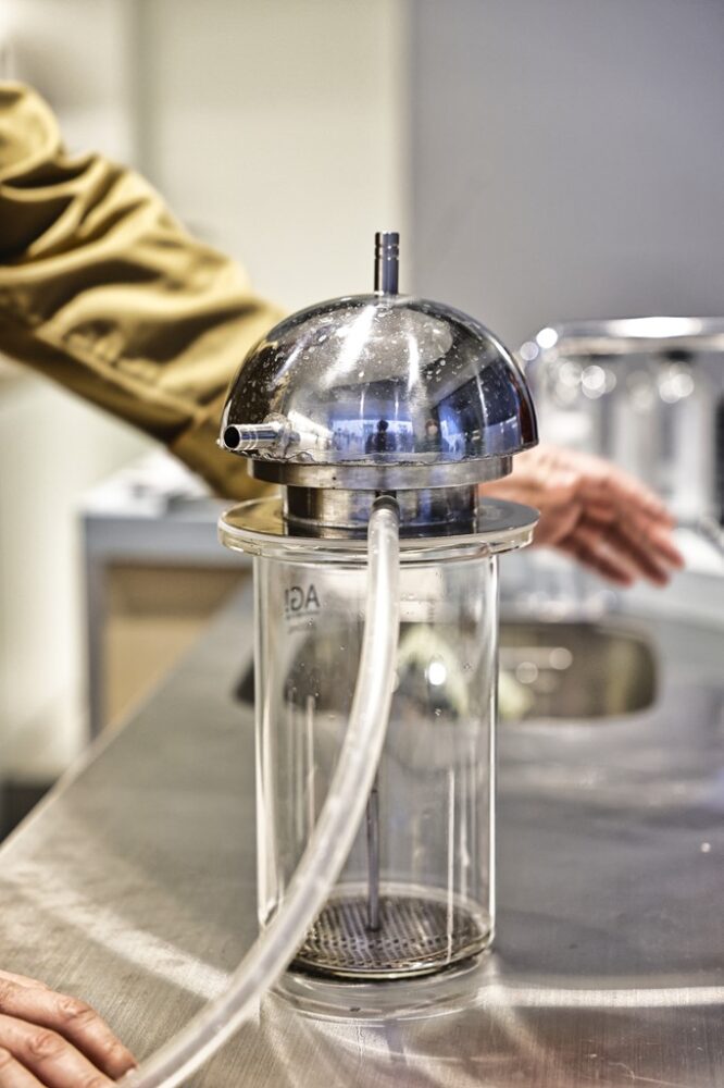 均等に熱が加わるように混ぜていくが、その後はフラスコを被せて蒸留させる。その様子をフラスコの耐熱ガラス越しに見られるため、本当に理化学の実験みたい。