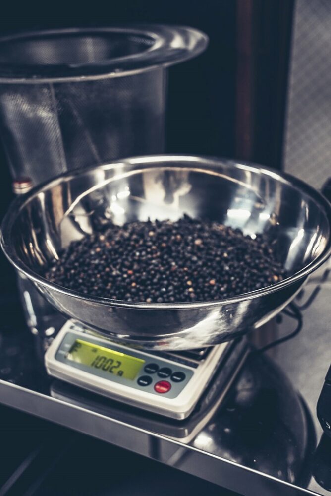 まずは基本となる素材、ジュニパーベリーの分量をしっかりと測ることから。収穫地によって異なる香りや風味も考慮する必要がある。