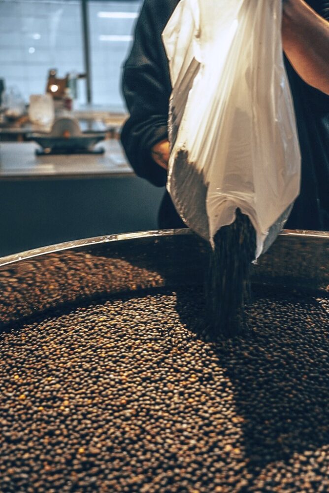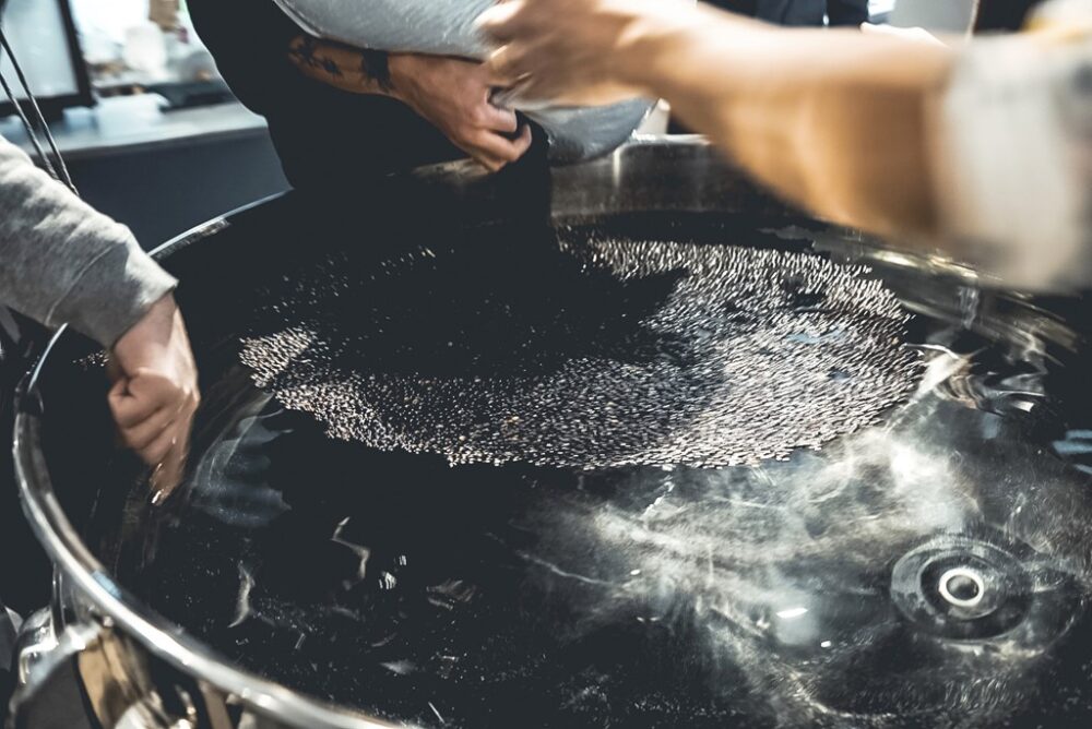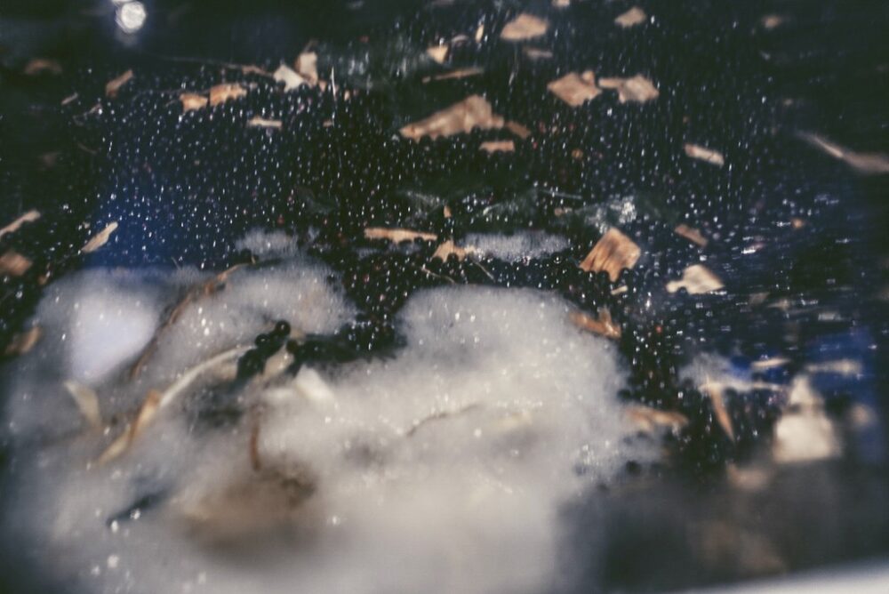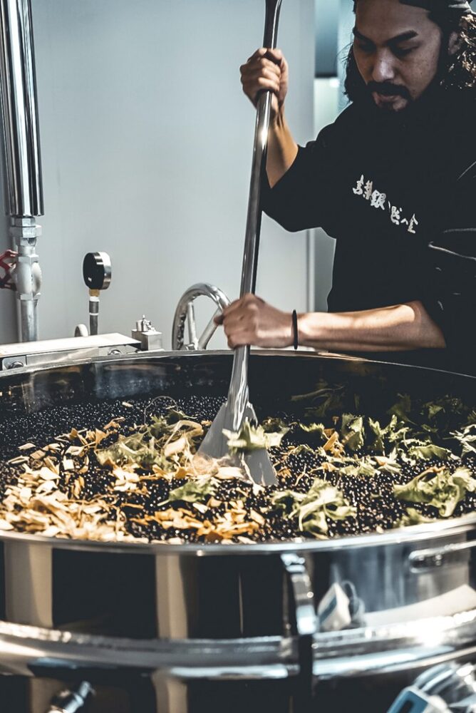 アルコールで満たされた蒸留機になかでもジュニパーベリーを投入。一定の温度を保つために、ゆっくりとかきかき混ぜながら入れる。