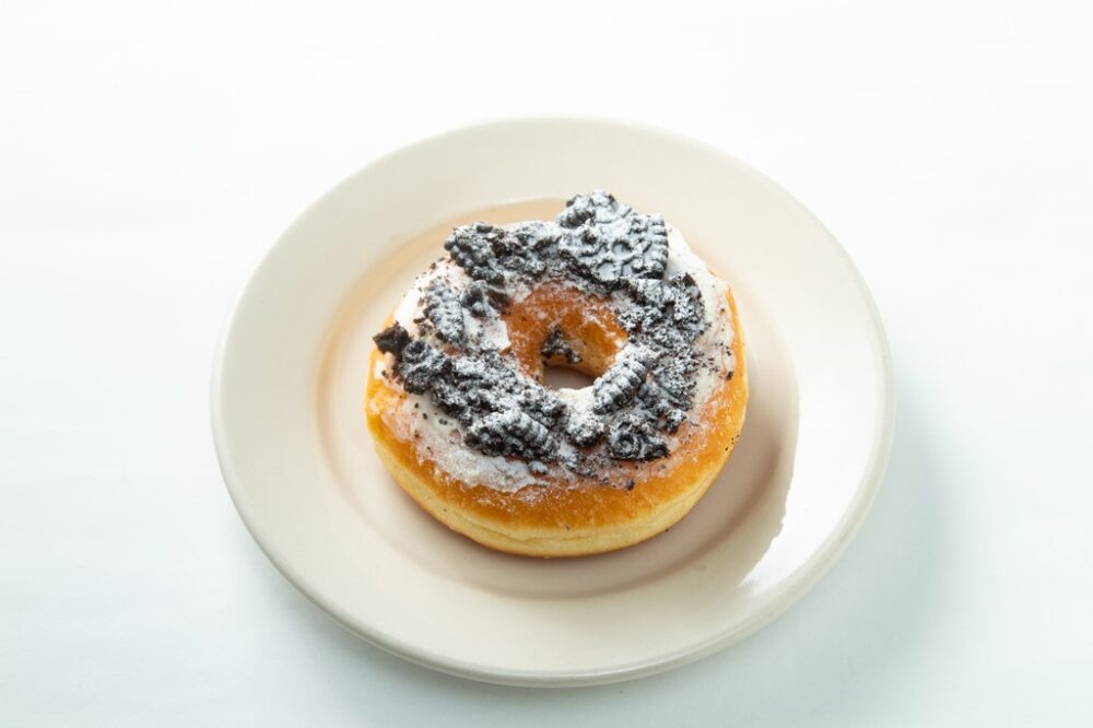 クリームチーズとサワークリームを合わせた爽やかなクリームに、粗めに砕いたココアビスケットをトッピング。ふんわりとしたドーナツ生地とココアビスケットの食感が合わさって、とてもユニーク。クセになる味。390円