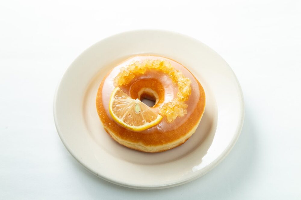 レモンのグレーズの上に、砂糖で煮詰めたレモンピールとレモンスライスをトッピングした甘酸っぱいドーナツ。柑橘系ならではのすっきりとした食べやすさがクセになる。いろいろな食感を楽しめるのも面白い。390円