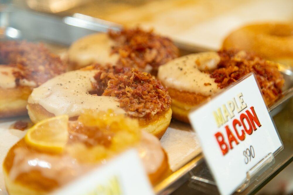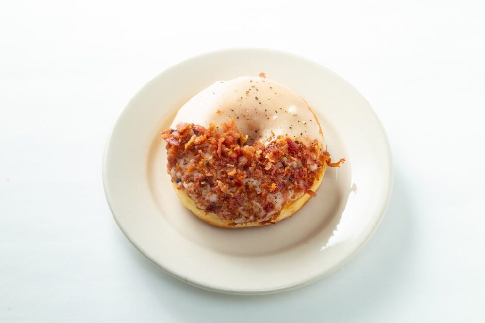 アメリカでは甘いだけがドーナツじゃない! フレーク状にしたベーコンを低温で揚げて、メープルグレースをかけた当店のNo.1、2を争うほどの人気ドーナツ。甘いとしょっぱいが混じり合い、軽食にもぴったり。390円