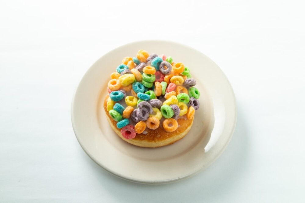 LAから輸入しているカラフルなシリアルをたっぷりとのせた見た目にもインパクトのあるドーナツ。シリアル自体は甘くないので、食べやすく食感も楽しい。キッズにも大人気。420円