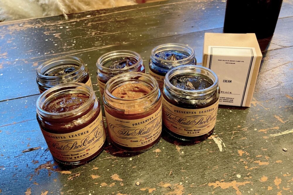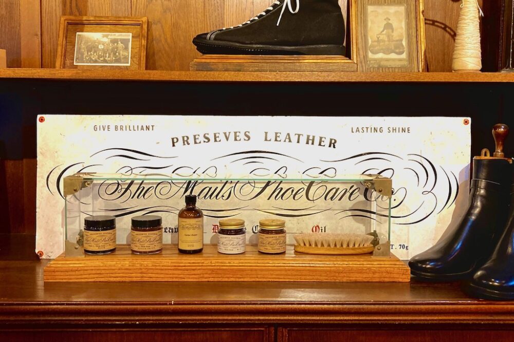 様々なデザイン、素材、そしてあらゆる年代のシューズやブーツを扱ってきたなかで導き出されたのが、クリームやクリーナー、それにブラシなど。各グッズに理想とするものを求めた結果、生産国までそれぞれ違うというのがおもしろい。