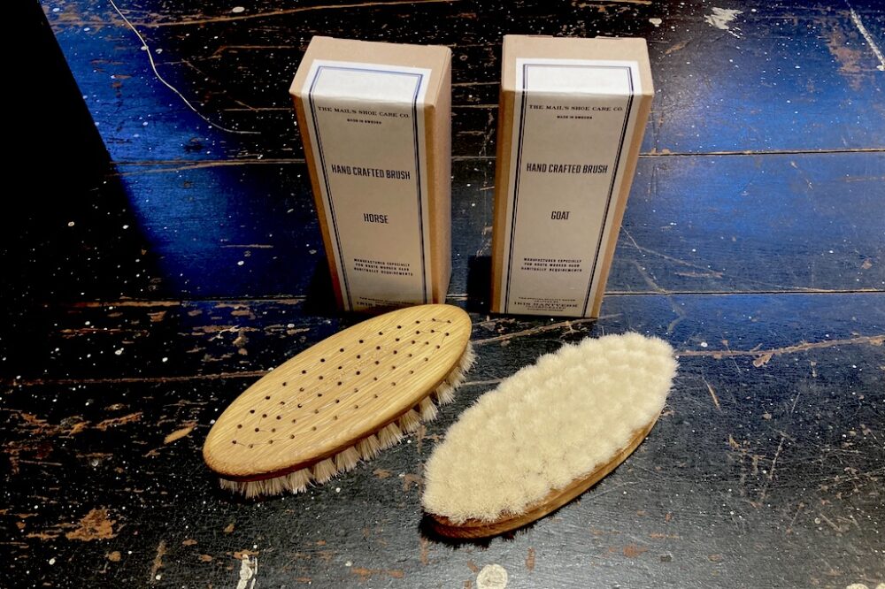 スウェーデンで現在でもハンドメイドでブラシを生産しているIRIS HANTVERK(イリスハントバーク)とダブルネームになるブラシ。できるかぎり天然素材を無染色で使うシンプルなデザインが特徴で、余計な成分を革に与えることがないので革にも優しい。コシのある汚れ取り用のホースヘアと、仕上げ磨き用の柔らかいゴートヘアの2種類で展開している。ブラシは汚れ取り用と仕上げ用の2種類は必須。各6380円