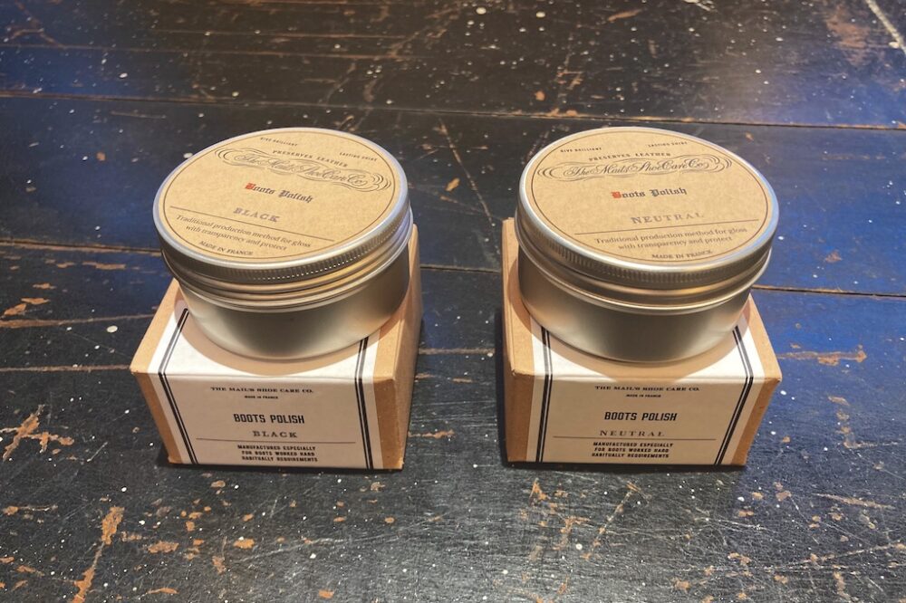 革のツヤ出し用に調合されたワックス。柔らかい布や手指にワックスを取って、薄く均等に伸ばした後に仕上げ用の柔らかい布や柔らかい山羊毛のブラシで磨くことで、表面に保護膜ができて艶が出る。ブラックと無色で展開している。フランス製。各2530円