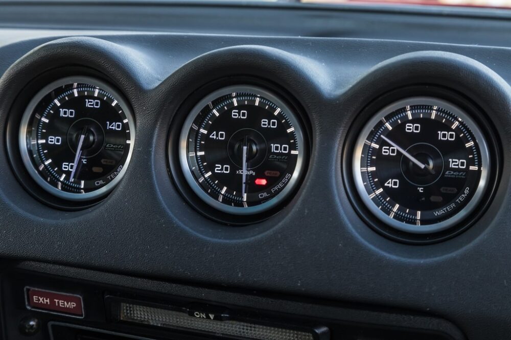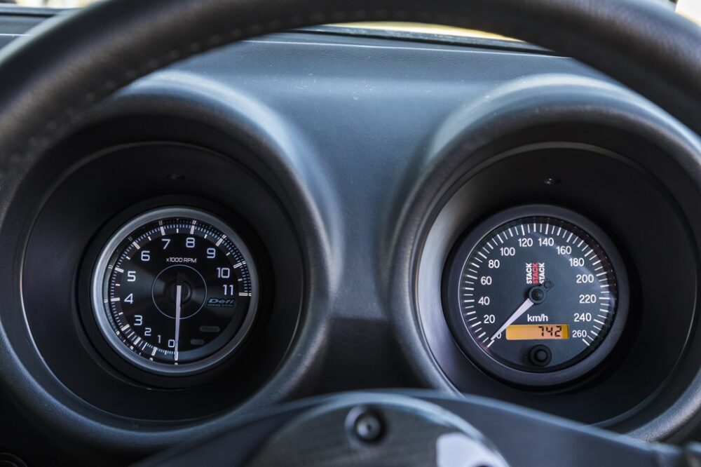ダッシュ周りは基本的にストック風だが、電動パワステ化。さらに純正位置にマウントされる計器類もDefiのタコメーターに、STACKのスピードメーターで、センターに備わる油温、油圧、水温の3連メーターもDefi製で統一している。