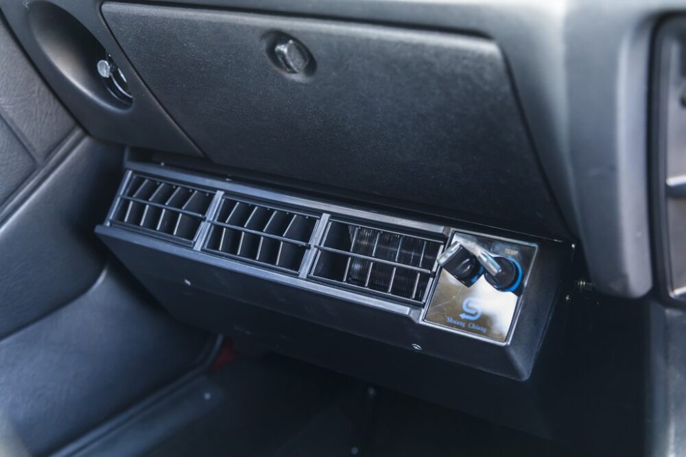 助手先足元にはクーラーを装着。こちらもR134aガスが使用可能なスターロードオリジナルのキット。ハコスカやZ専用のキットでリリースされる。