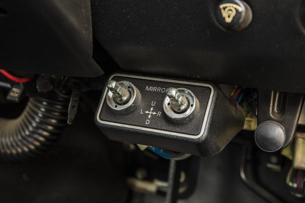 ハンドルの右下が「リモコン式フェンダーミラー」だ。左右のスイッチをウニウニと動かして、ミラー角度を調整する。