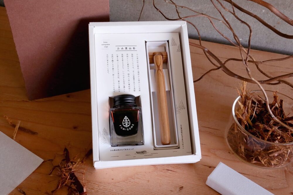 「ひみ里山杉からできたインクとつけペンセット」インクだけでなく、つけペンの軸も氷見の杉で作られているそうだ(7150円)。インクのみでも販売(2750円)
