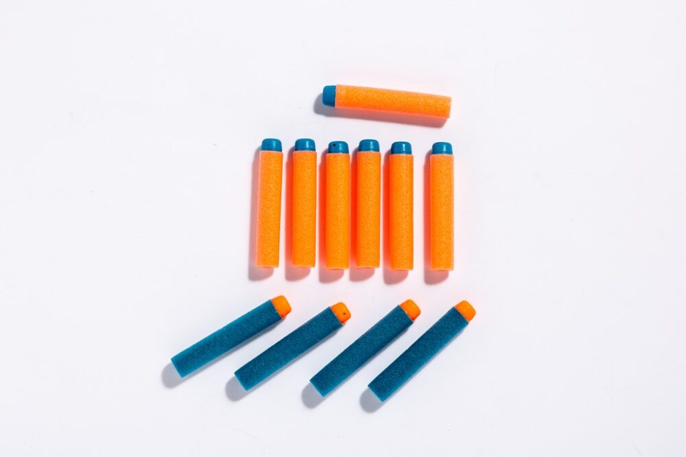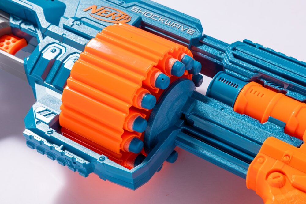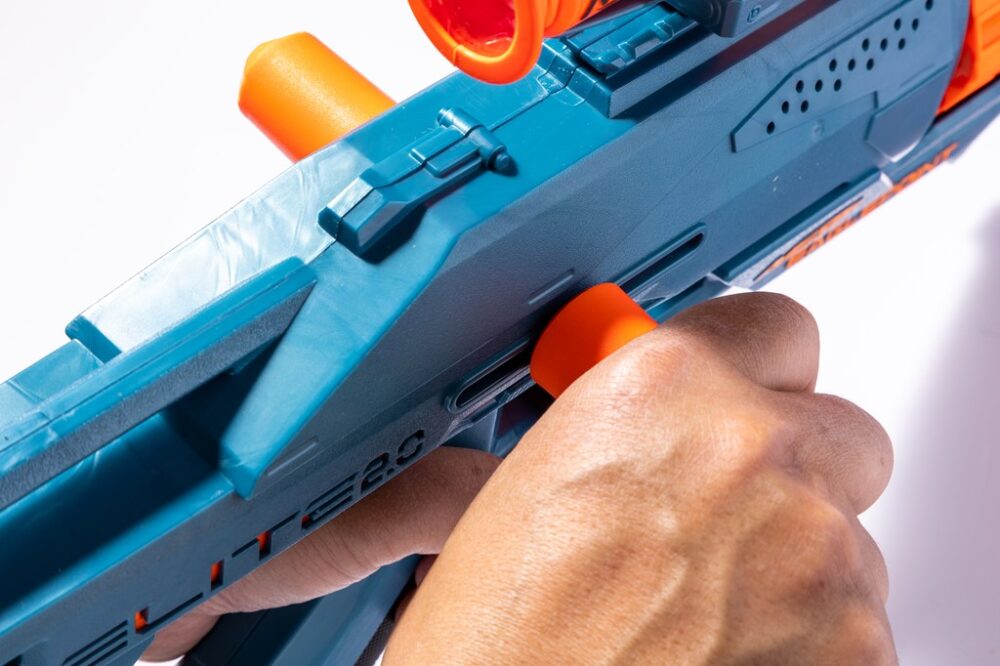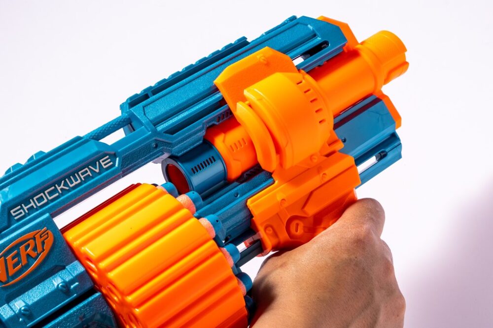 しかし単に子供向けだからとシンプルなデザインにするのではなく、それぞれに心をくすぐるギミックが搭載されているのが注目ポイント。この「ナーフ エリート2.0」シリーズは、レバーやグリップをガシャリと引く(コッキング)ことで、プラスチックのダーツのようなスポンジ状の弾を装填して撃つモデル。