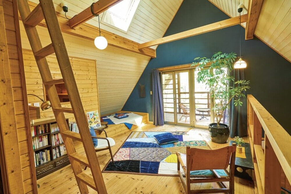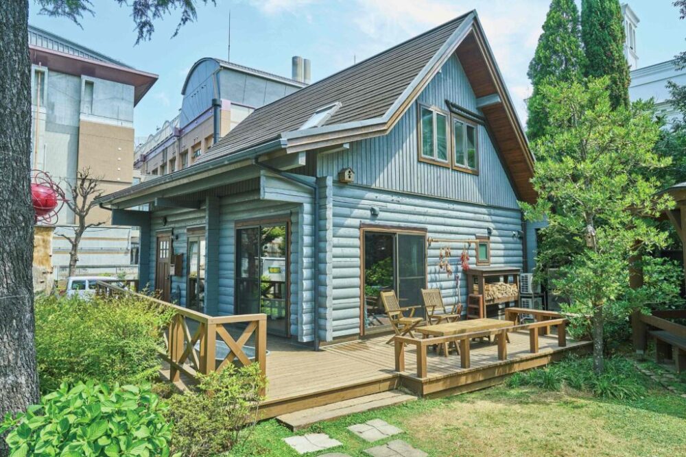 アメリカのカントリーサイドにポツンと建つログハウスのような可愛らしい外観が魅力のカントリーログ。エントランスを入ると土間空間が広がり、木の柔らかい香りが空間を満たしている。青いカラーも◎だ。