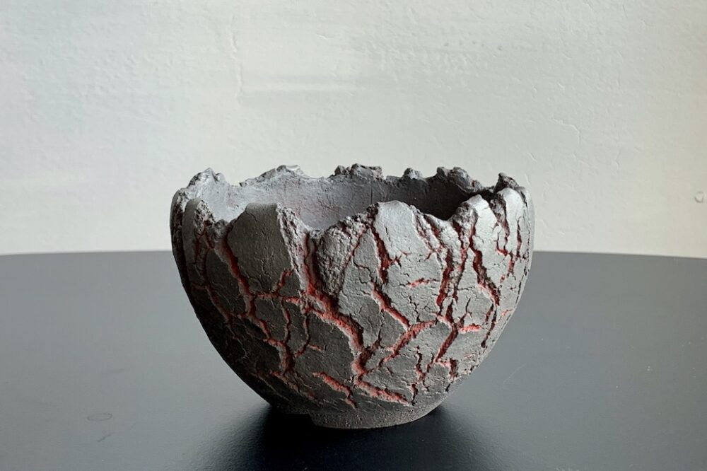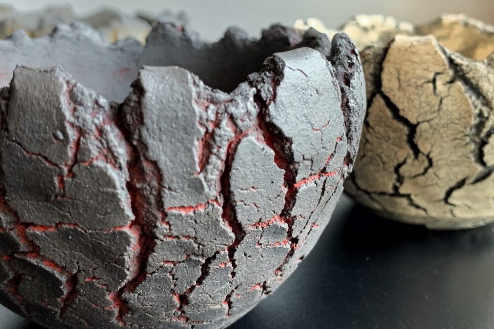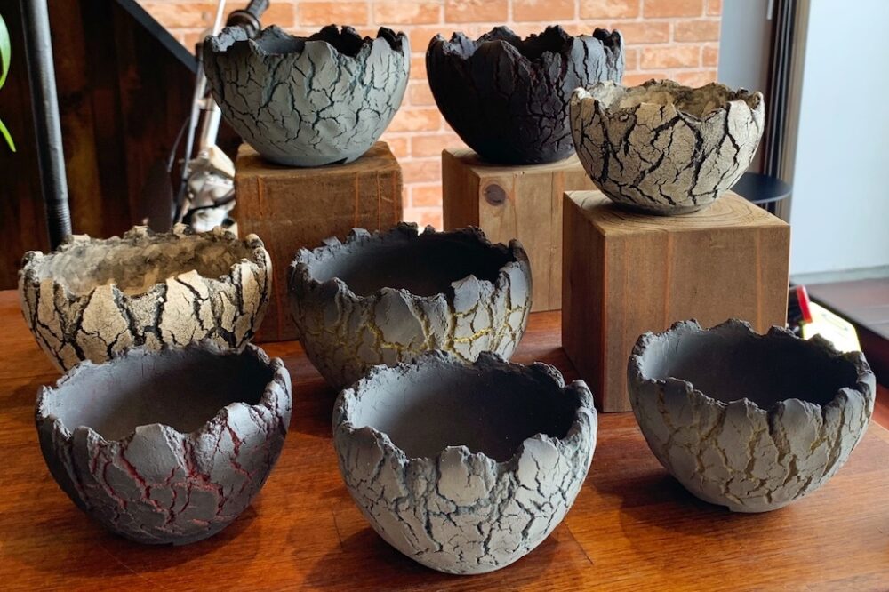 アメリカで習得した技法が活かされた、表面に刻まれる独特のひび割れが特徴的です。