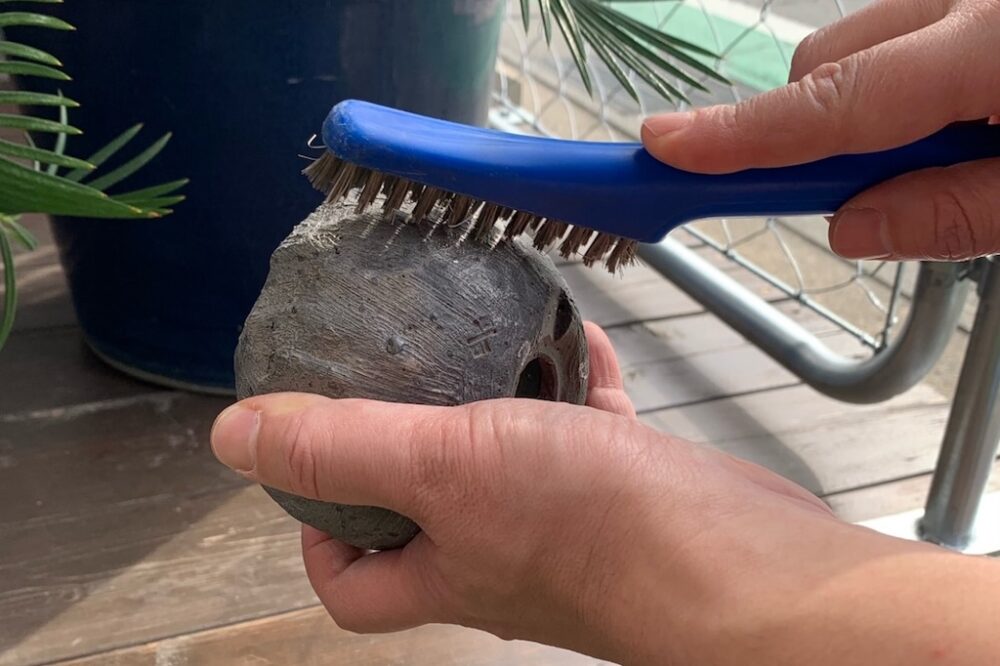 硫化させた状態のザラザラとしたAg potをワイヤーブラシで磨いてみます。力はあまり加えずに、表面のザラつきを落とす感じで全体を磨いていきます。
