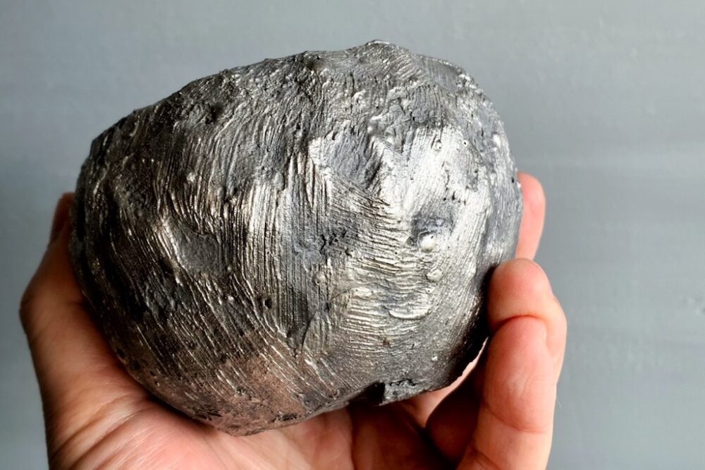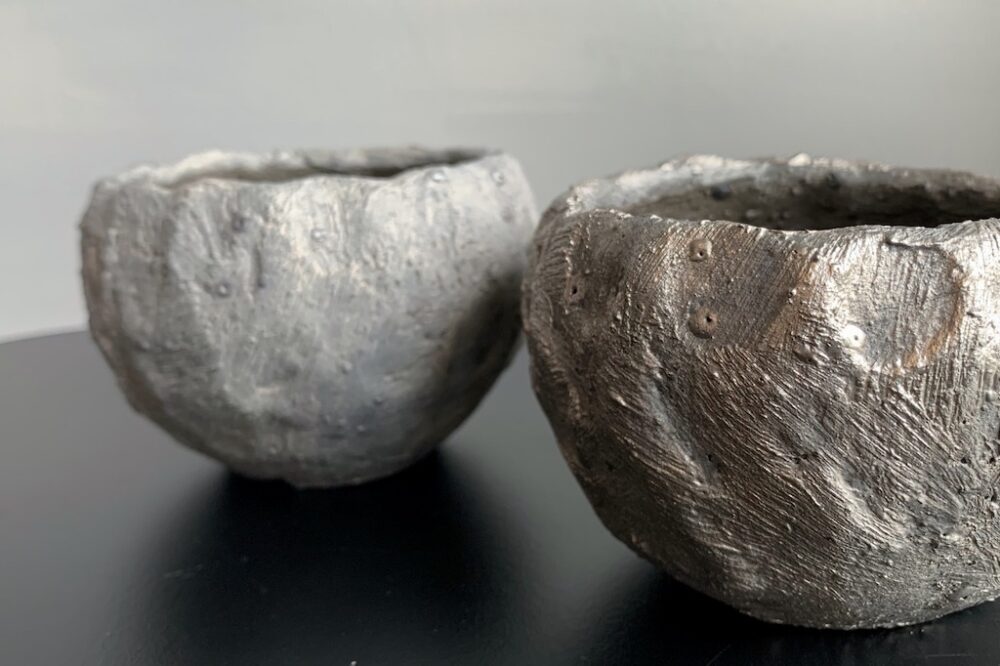 こちらの作品は、鉢の表面を銀で仕上げたAg pot(Ag=銀)。これは銀色の釉薬ではなく、陶芸用の銀(成分90%以上)を焼き付けた後に硫黄系の温泉に浸けて表面を硫化させた陶器鉢です。