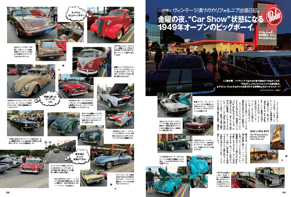 ここ数年間、パンデミックでなかなか海外取材ができませんでしたが、今月は久しぶりにカリフォルニア出張を敢行。Car Showさながらの光景が広がる金曜夜のBob’s からスタートし、巨大アンティークショップ、ヴィンテージショー、ロウズボウル……とカリフォルニアを堪能してきた様子をレポートします。