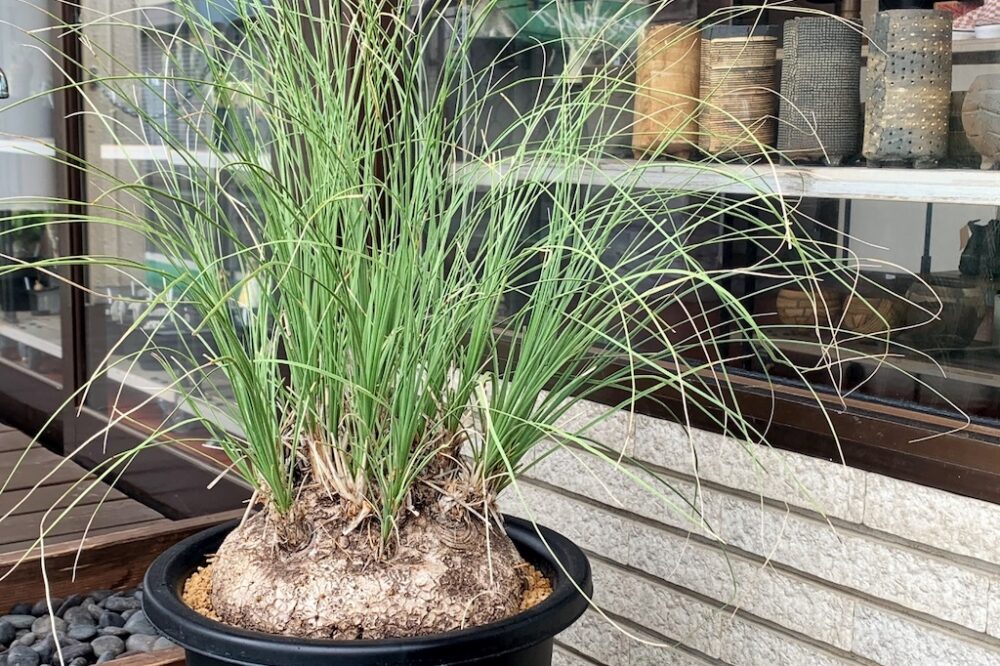 表皮がひび割れた大きな塊根と、無数に伸びる細長い葉が特徴的な塊根植物カリバナス・フーケリー。メキシコの乾燥地帯にのみ分布する希少種で、一度見たら忘れない容姿を持つ魅力的な塊根植物です。