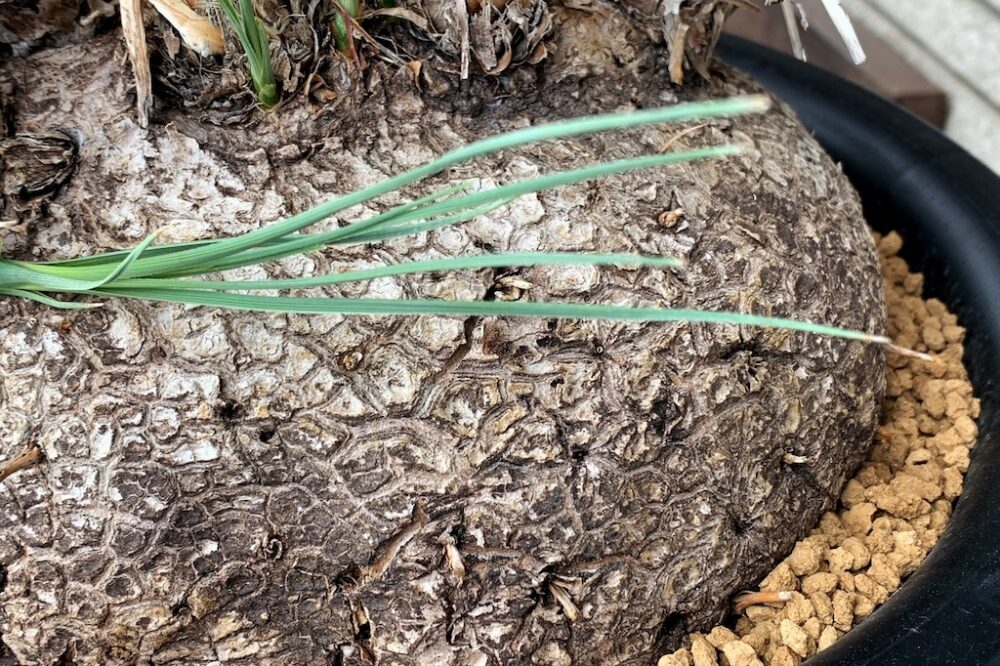 強烈な日差しが降り注ぐ、メキシコの乾燥地帯でも生き続けることができる理由はこの大きな塊根にあります。表皮には無数の亀裂があり、古木の様な表情をしていますが、この厚く硬い表皮が強い日差しから身を守り、大きな塊根に水を貯めることで、長期に渡る乾燥にも耐えることができると言われています。