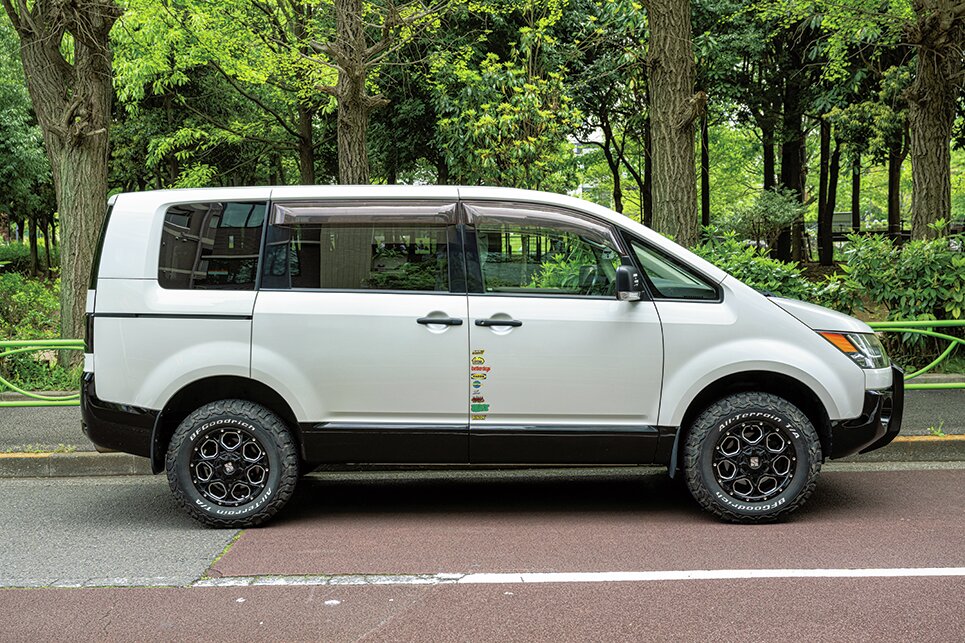 実はこれに乗る前もデリカだったんですけど、今のはグレーだった色をホワイトに変えてリフトアップさせてます。タイヤもオールテレインのマッドタイプにして、ライトの色も変えたので、機能性はかなりアップデートしたかなと。