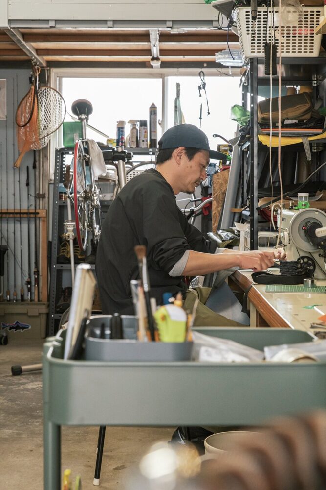 大のアウトドア&自転車好きが高じて、トレッキング、バイクパッキング、フィッシングを軸としたナーディマウンテンワークスを立ち上げた荒井さん。看板商品であるバッグは、自社のアトリエで裁断から縫製まで行っているガレージブランドだ。自身のプロダクトのテストや新たなアイデアを得るために、行っているのが、バイクパッキングである。
