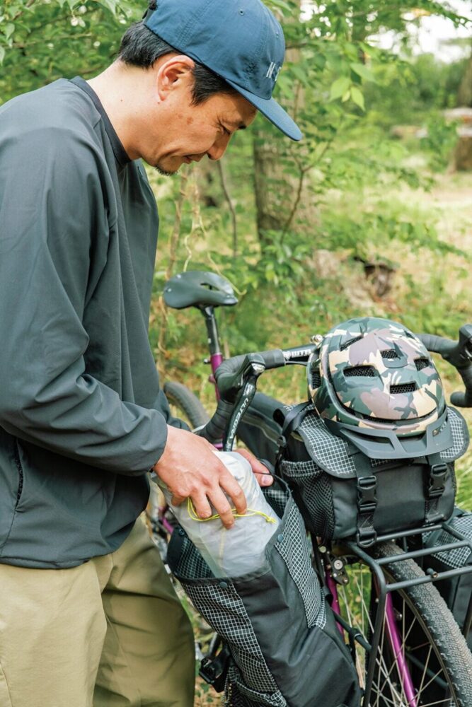 愛用しているアイテムは、登山向けのウルトラライト系のギアが中心。コンパクトかつ軽量なので、持久力が大事なバイクパッキングにも相性が良い。