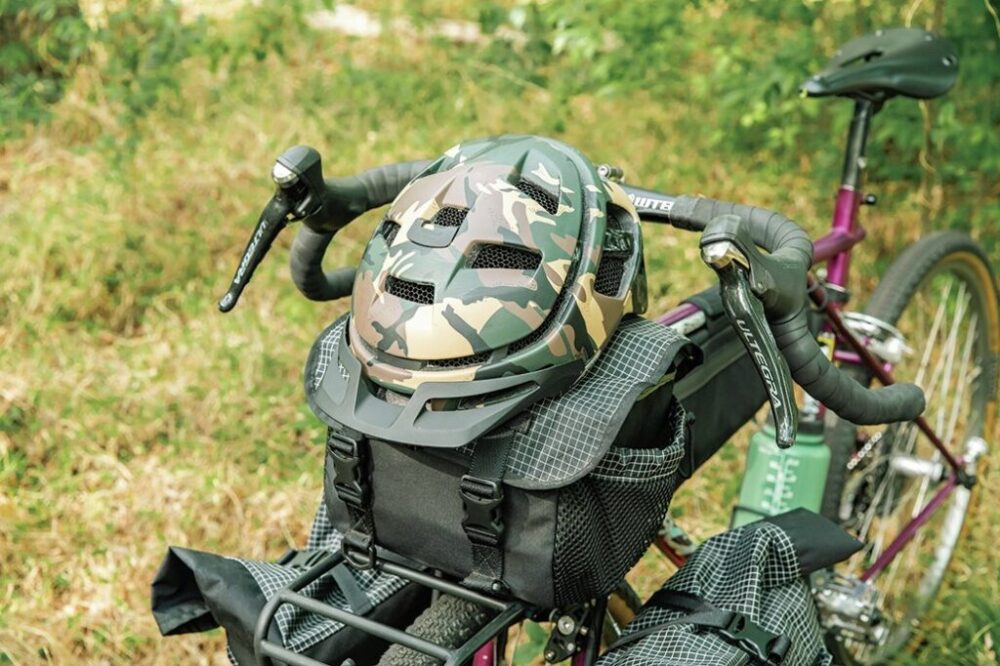 山道を走ることも多いため、自転車用のヘルメットはマスト。愛用しているのはイギリスのスミス製で、マウンテンバイク向けのモデル。カモフラも個性的。