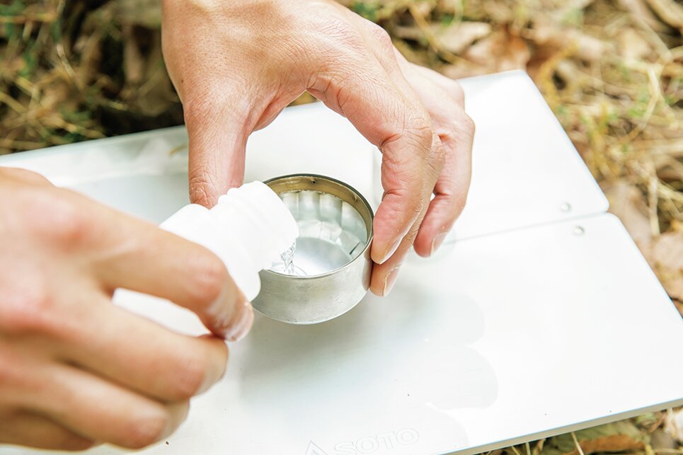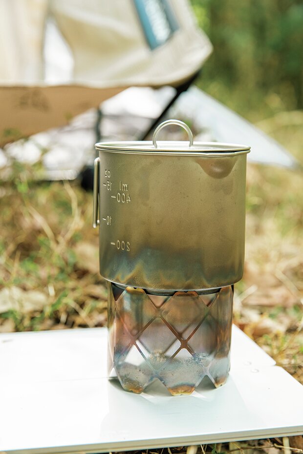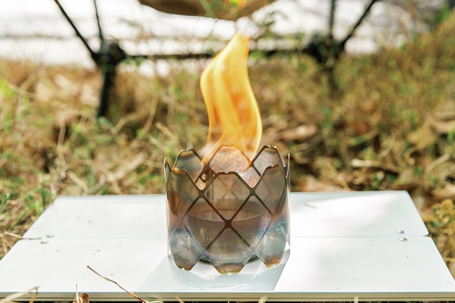 バイクパッキングは料理を楽しむキャンプスタイルではないため、携行性や手に入れやすさも踏まえて市販のアルコール燃料を使える原始的なストーブを愛用。実は空き缶で作ったもので、友人が自作してくれたそうだ。