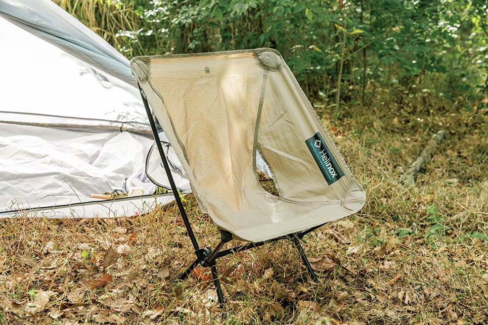軽くてコンパクトに収納できるためヘリノックスのチェアを愛用。薄手のリップストップナイロンを使っているので、より軽量である。