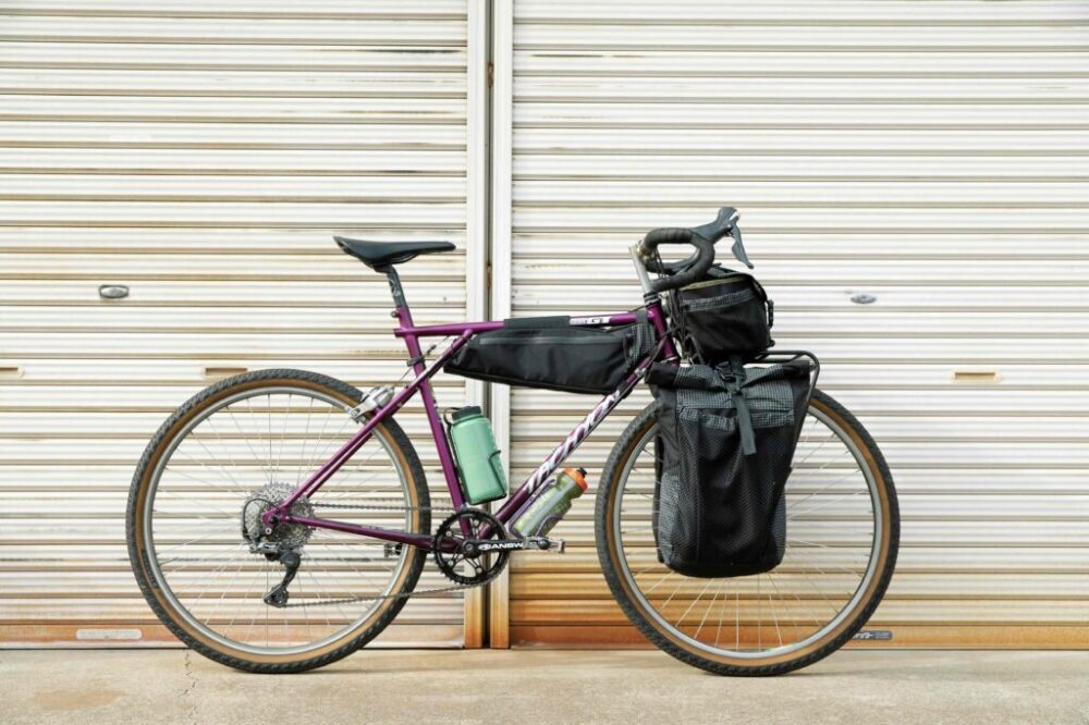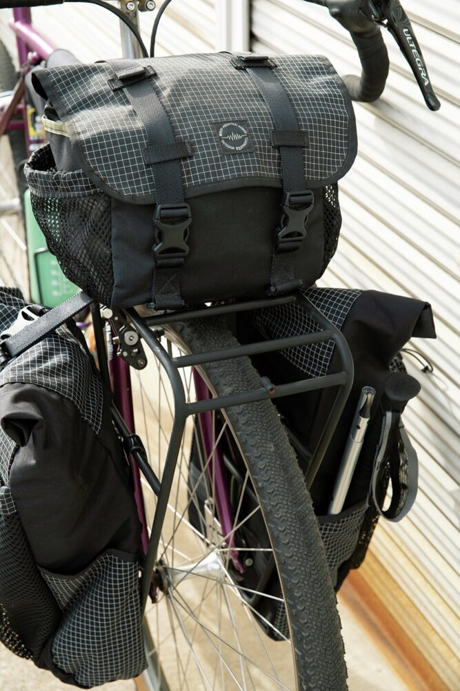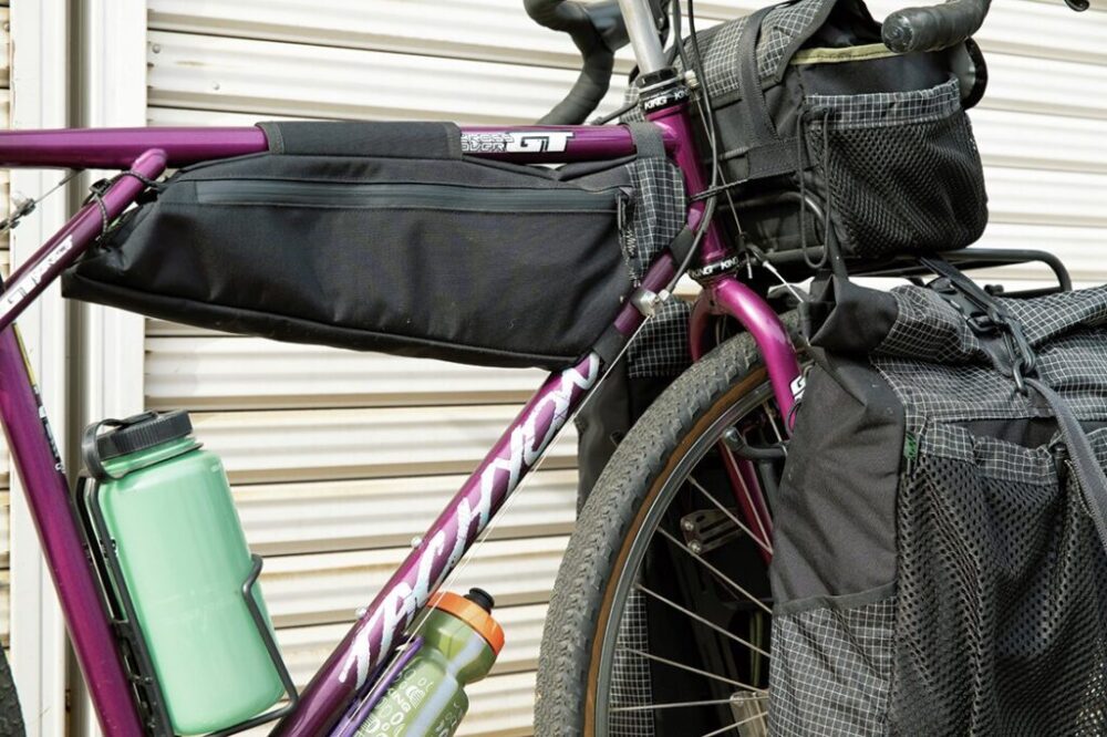 ハンドルバーバッグとパニアバッグに加え、フレームバッグも使用している。この積載量でもウルトラライトのアイテムなら1〜2泊程度のキャンプが可能だ。