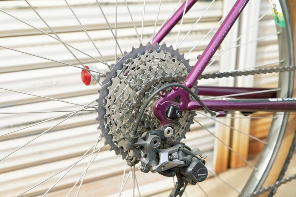 リアエンドは特殊な加工をして、現行のシマノのグラベル向けコンポーネントであるGRXを装着。11スピードにアップデートされたので、山道も快適に走れる。