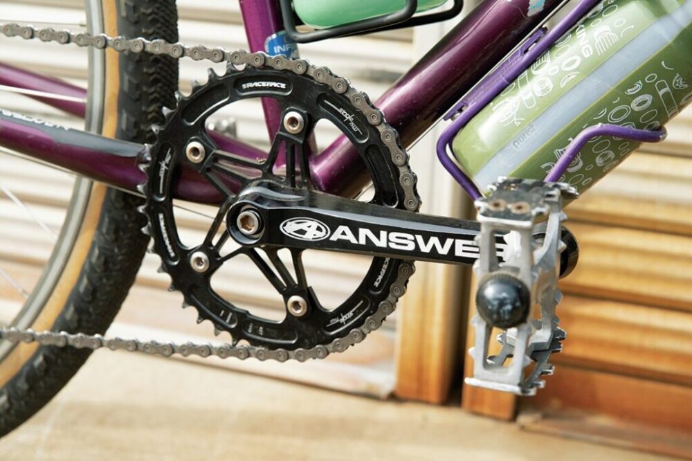 急斜面を登ることも多いため、回転数を上げるためにBMXのレース用のクランクをチョイスした。アンサーというメーカーのもので見た目も◎